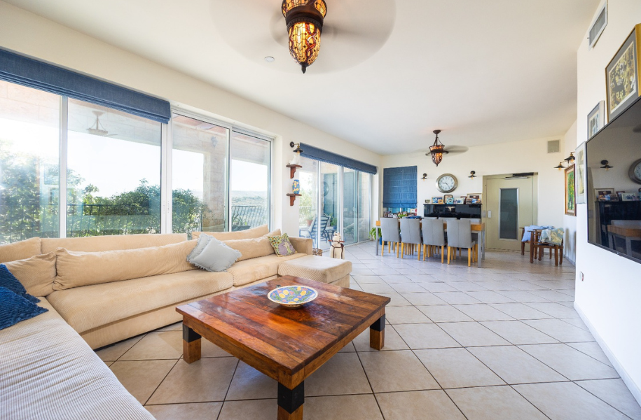 The home has been thoughtfully designed throughout, with spacious living areas, high ceilings, and stunning views of the Judean Hills.